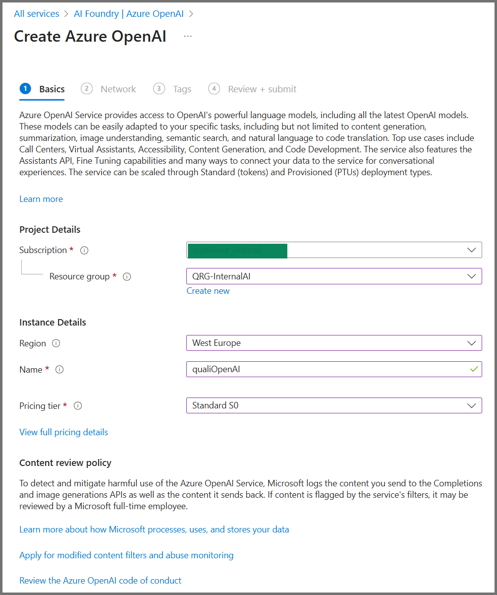Azure OpenAI is a Microsoft Azure service providing access to OpenAI models and tooling for building intelligent applications (NLP, computer vision, deep learning). QualiWare AI uses this service for its conversational and retrieval features.