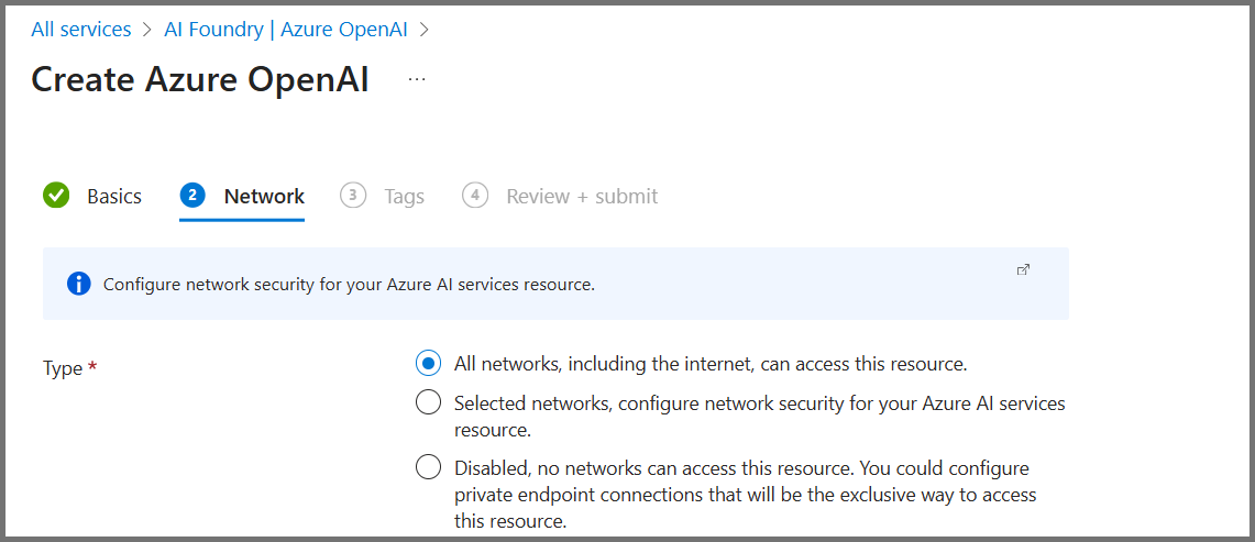 - Tags are optional. Proceed to Review + create and then Create to provision the service.