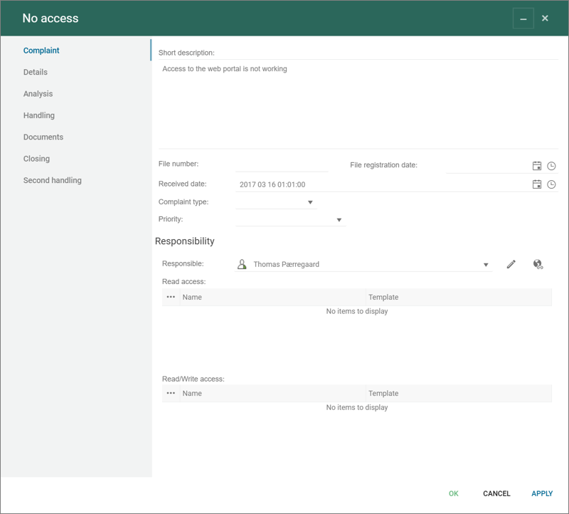 This template can be used to describe complaints, e.g. from customers or other external parties.