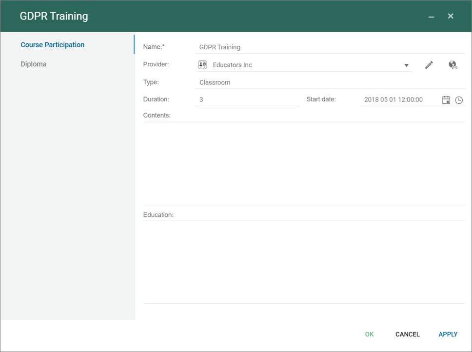 This template is used to document a persons participation to a course, and associate related content to the course (diploma)